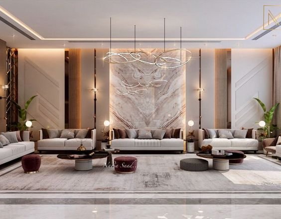 تتميز بالتفاصيل الدقيقة والألوان الدافئة مع دمج الرخام والجبس بورد لإضفاء لمسة فخمة.